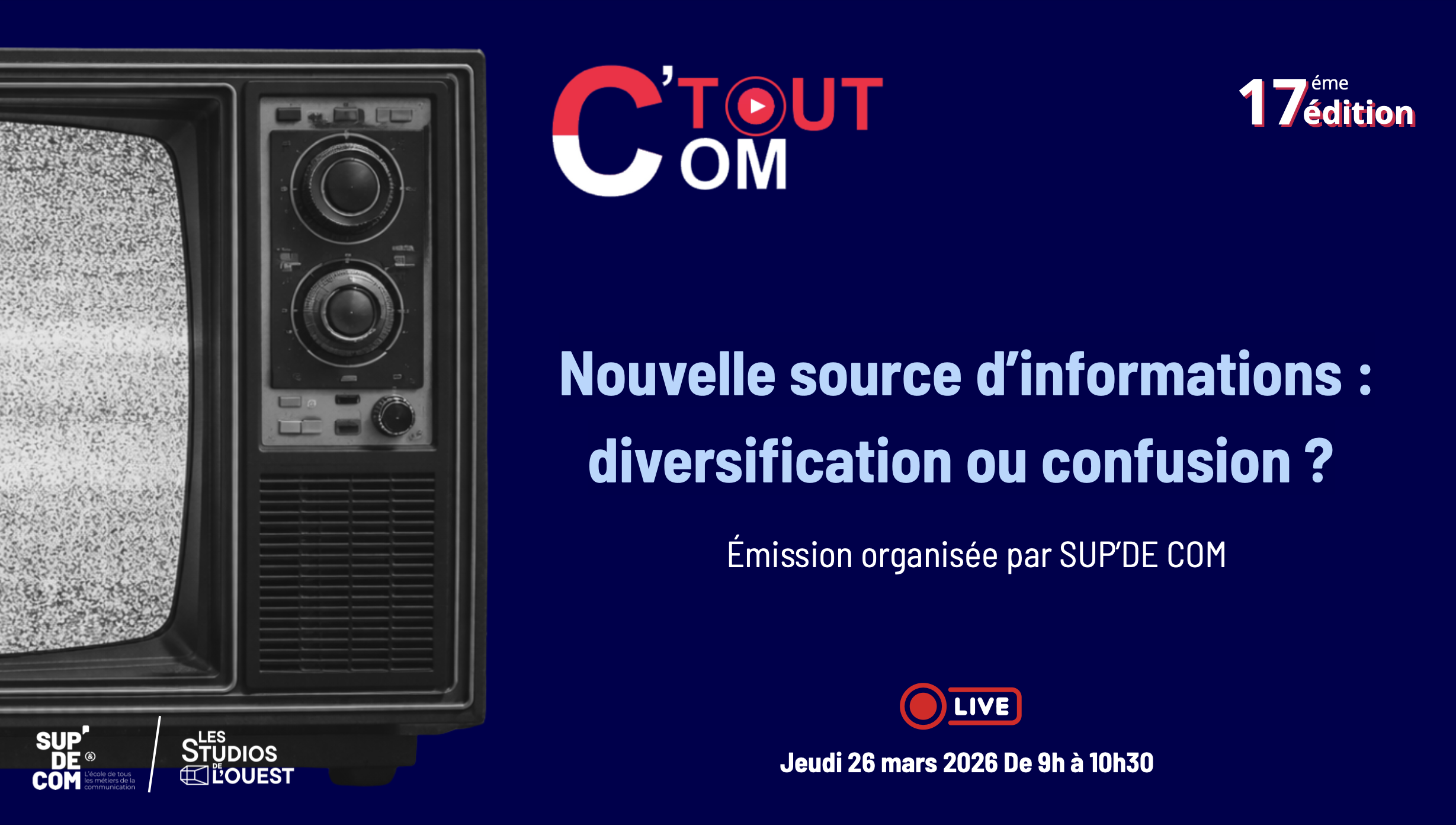 À l’heure où l’information se fragmente entre médias traditionnels et plateformes numériques, comment garantir fiabilité, rapidité et pertinence ? Les jeunes générations privilégient des contenus courts et personnalisés, souvent au détriment de la vérification. Cette 17ᵉ édition de C’TOUT COM, organisée par SUP’DE COM, propose un débat en direct pour :